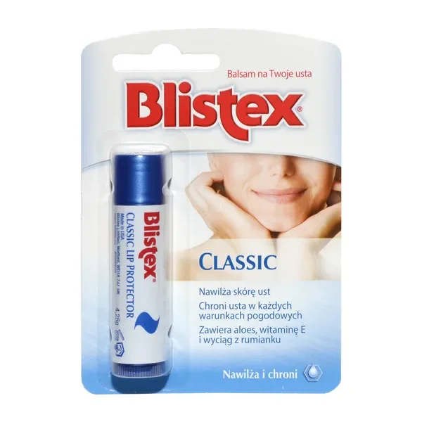 Blistex Classic to balsam do ust w postaci sztyftu, który skutecznie nawilża i odżywia delikatną skórę warg. Produkt zapewnia ochronę przed niekorzystnymi warunkami atmosferycznymi oraz przeciwdziała wysuszaniu ust.