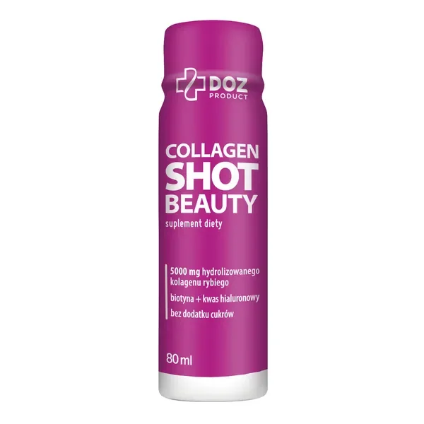 DOZ Product Collagen Shot Beauty to innowacyjny suplement diety w formie płynu, który łączy w sobie moc hydrolizowanego kolagenu rybiego z kwasem hialuronowym i kluczowymi witaminami. Produkt w smaku mango-marakuja został stworzony z myślą o osobach dbających o zdrowie skóry i młody wygląd.