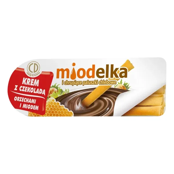Miodelka to wygodna przekąska łącząca kremowy smak czekolady z chrupiącymi paluszkami chlebowymi. Produkt został stworzony z myślą o dzieciach, oferując połączenie słodyczy z praktyczną formą podawania.