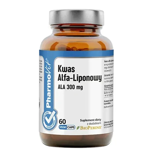 Kwas Alfa-Liponowy 300 mg to zaawansowany suplement diety firmy Pharmovit Clean Label, który łączy wysoką dawkę kwasu alfa-liponowego z innowacyjnym ekstraktem BioPerine®. Produkt został opracowany z myślą o dorosłych osobach poszukujących wsparcia antyoksydacyjnego w postaci wygodnych kapsułek.