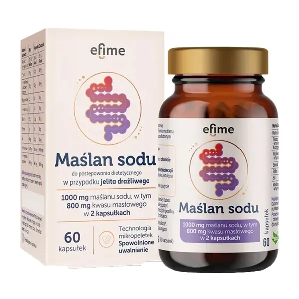 Maślan sodu 500mg to specjalistyczny preparat dietetyczny firmy Efime, opracowany z myślą o wsparciu zdrowia układu pokarmowego. Zawiera kwas masłowy w postaci maślanu sodu, zamknięty w innowacyjnych mikropeletkach o kontrolowanym uwalnianiu.