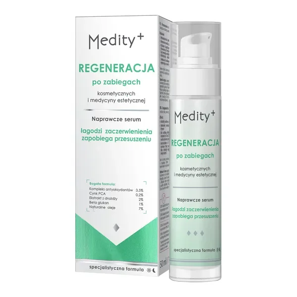 Medity+ Regeneracja to specjalistyczne serum naprawcze przeznaczone dla skóry po intensywnych zabiegach i narażonej na stres. Produkt wykorzystuje zaawansowaną technologię emulsji wielokrotnej W-O-W oraz mikronizację składników aktywnych, co zapewnia głęboką penetrację formuły. Zawiera 7% naturalnych olejów oraz kompleks kojących składników, które natychmiast łagodzą podrażnienia i przywracają skórze komfort.