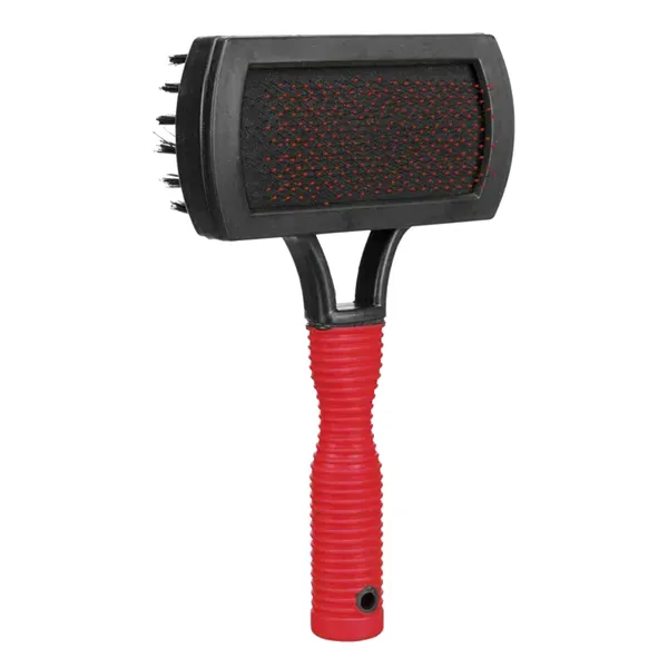 Dwustronna budowa umożliwia kompleksową opiekę nad sierścią zwierzęcia. Jedna strona wyposażona w bezpieczne druty z kulkami delikatnie usuwa podszerstek, martwe włosy oraz zanieczyszczenia bez drażnienia skóry. Druga strona z włókien nylonowych służy do wygładzania i nadawania blasku sierści. Systematyczne używanie szczotki wspomaga krążenie krwi oraz umożliwia wczesne zauważenie problemów dermatologicznych lub obecności pasożytów.