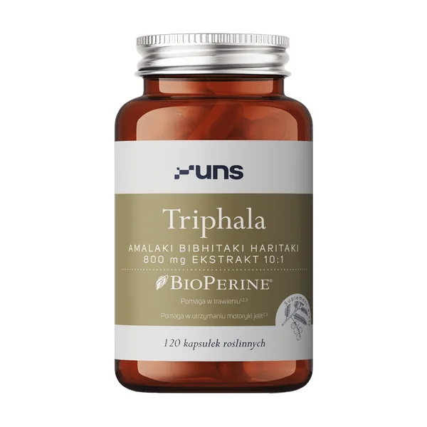 Suplement diety firmy Uns w formie kapsułek, który łączy w sobie ekstrakty z trzech owoców składających się na Triphalę oraz dodatek z pieprzu czarnego. Produkt został opracowany z myślą o osobach dorosłych.