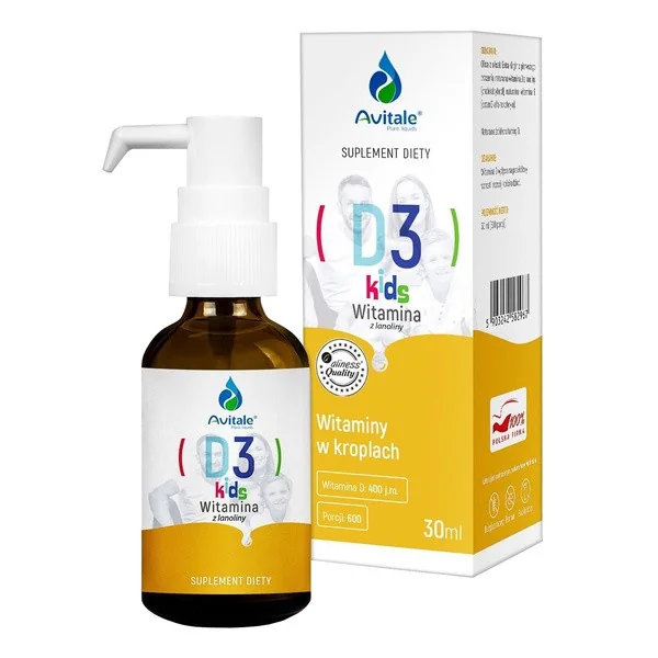 Avitale Witamina D3 Kids to innowacyjny suplement diety w formie kropli, specjalnie opracowany dla najmłodszych. Preparat łączy w sobie dwie kluczowe witaminy - D3 i E - w formule dostosowanej do potrzeb dzieci od 3. miesiąca życia.