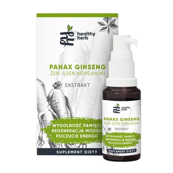 Suplement diety firmy Healthy Herb w postaci kropli zawierających ekstrakt z korzenia żeń-szenia koreańskiego. Produkt został opracowany z myślą o osobach dorosłych jako wsparcie w codziennej diecie.