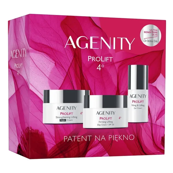 Zestaw Agenity 4º Prolift to kompleksowy program pielęgnacyjny opracowany specjalnie dla skóry dojrzałej w wieku 55-65 lat. Zawiera trzy preparaty: krem dzienny z filtrem SPF20, krem nocny oraz krem do pielęgnacji okolic oczu, które wspólnie działają na rzecz widocznego odmłodzenia i ujędrnienia skóry.