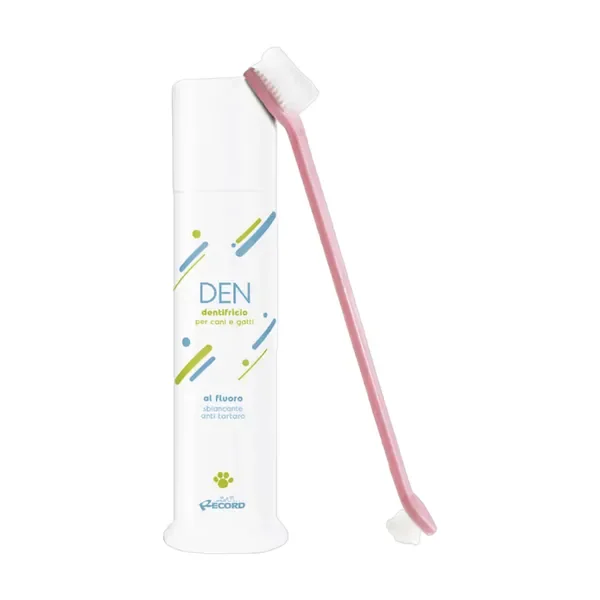 Kompleksowy system higieny jamy ustnej Record przeznaczony dla psów i kotów, składający się z pasty fluorowej o właściwościach wybielających i antybakteryjnych oraz dwustronnej szczoteczki z delikatnym włosiem. Umożliwia skuteczne czyszczenie zarówno większych zębów, jak i trudno osiągalnych miejsc w jamie ustnej zwierząt.